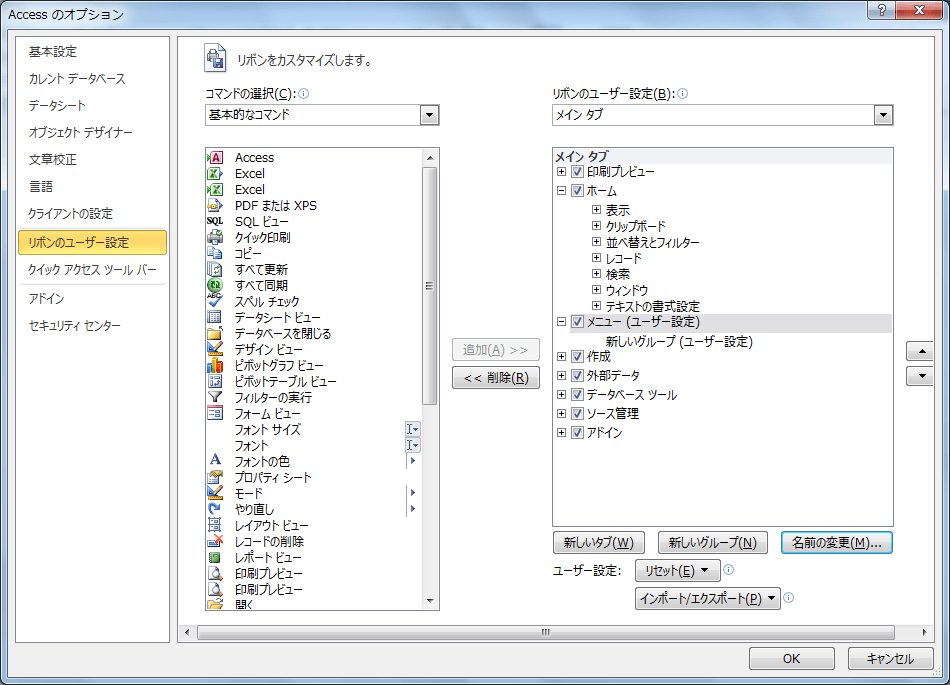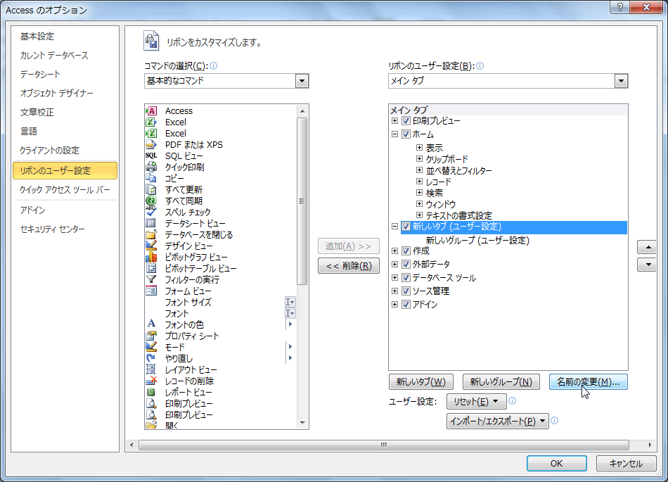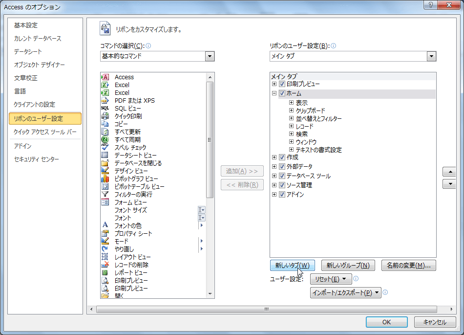 - [Accessのオプション]ダイアログボックスの[リボンのユーザー設定]を開きます。