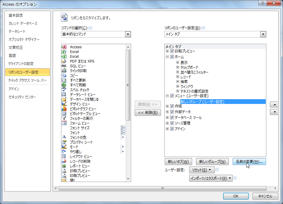 新しいタブを作成すると、グループもセットで生成されます(グループがないとコマンドの登録ができません)。「新しいグループ」を任意の名前に変更して、コマンドボタンを分類してみましょう。