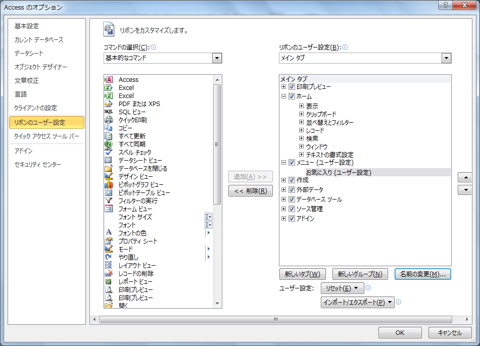 - [Accessのオプション]ダイアログボックスの[リボンのユーザー設定]を開きます。
