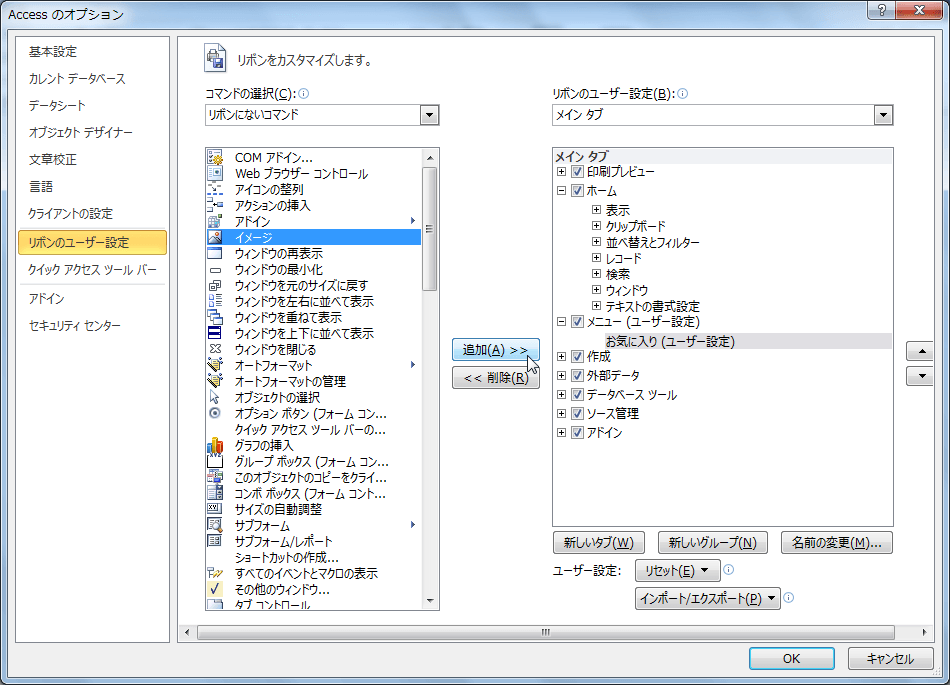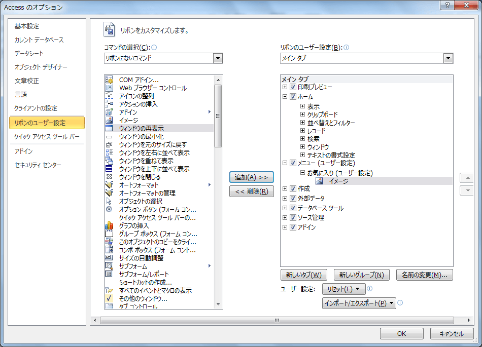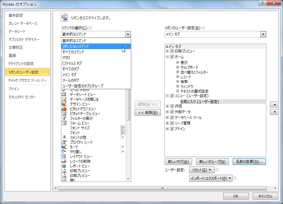 - [Accessのオプション]ダイアログボックスの[リボンのユーザー設定]を開きます。