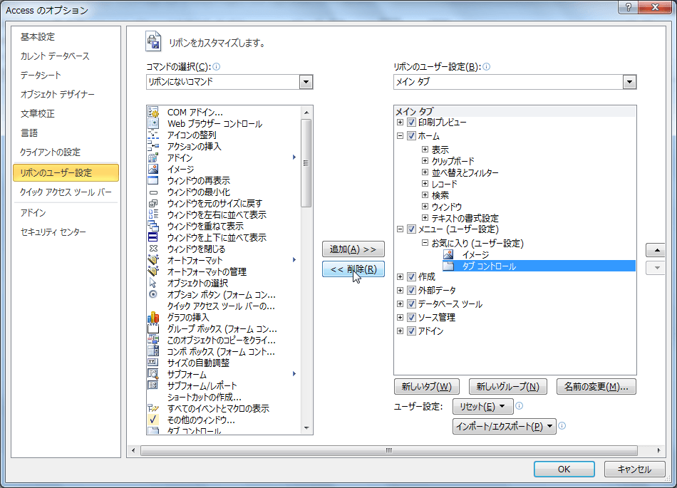 追加したコマンドを削除するには、削除したいコマンドを選択して、[削除]ボタンをクリックします。