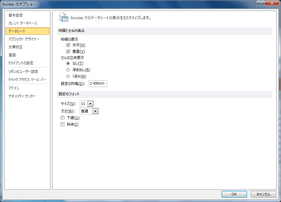 データベースのすべてのオブジェクトのデータシートの書式をカスタマイズするには、[Accessのオプション]ダイアログボックスの[データシート]をクリックして、それぞれ設定を変更します。
