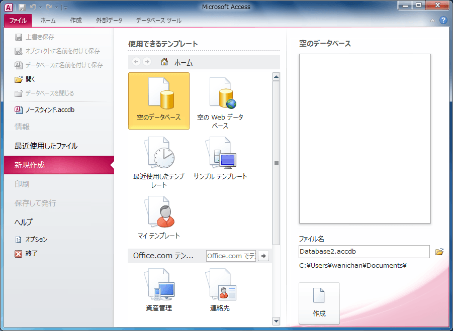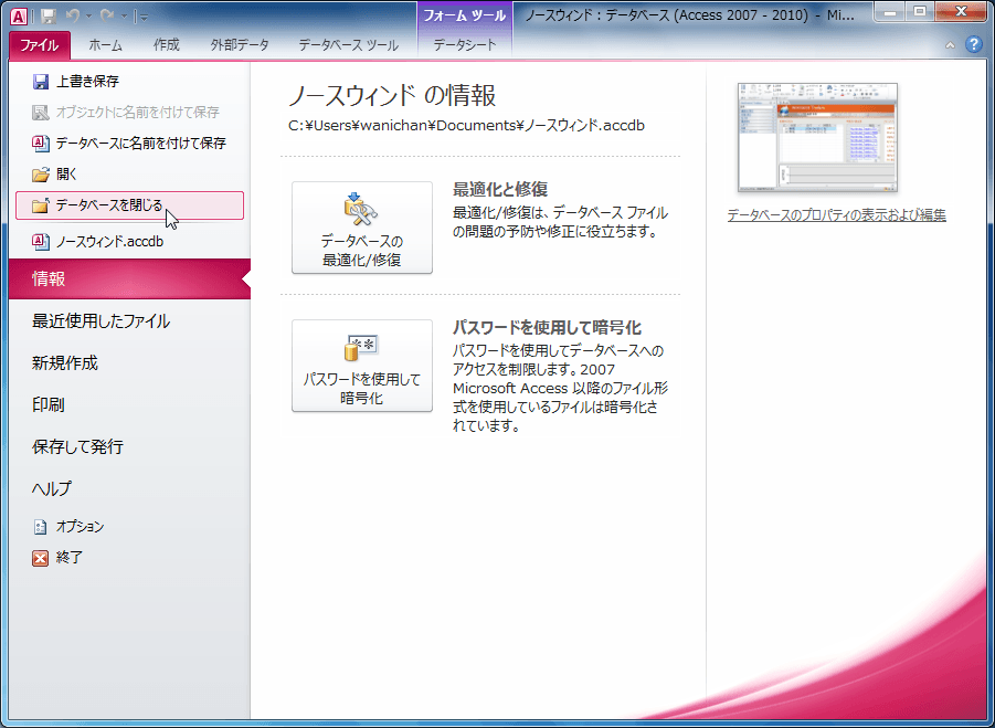 Access 2010を終了させずに、データベースだけを閉じるには、[ファイル]タブを開き、[データベースを閉じる]をクリックします。