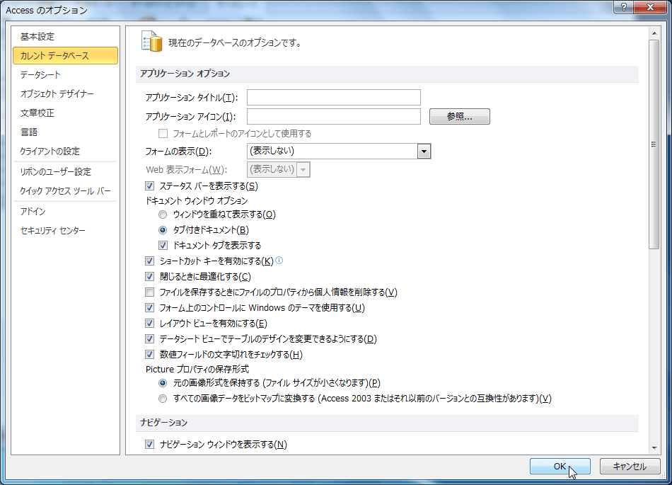 - [Accessのオプション]ダイアログボックスの[カレントデータベース]を開きます。
