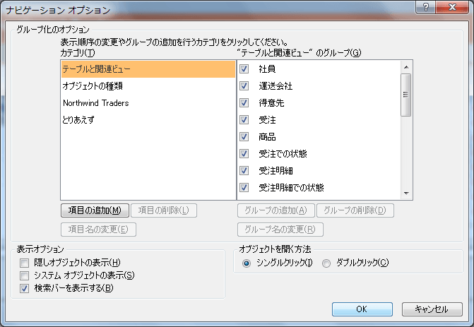 既定では、ダブルクリックでオブジェクトが開くようになりますが、シングルクリックで開くように設定することもできます。[ナビゲーションウィンドウのオプション]ダイアログボックスを表示し、[オブジェクトを開く方法]から[シングルクリック]を選択します。