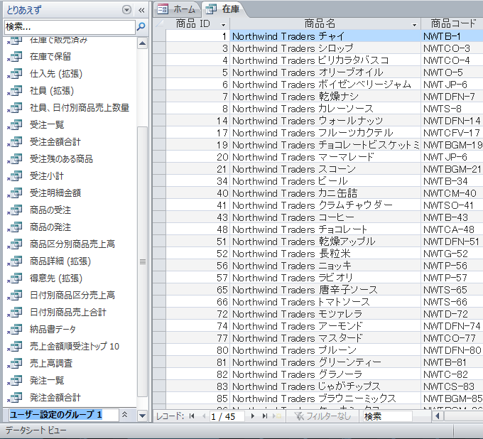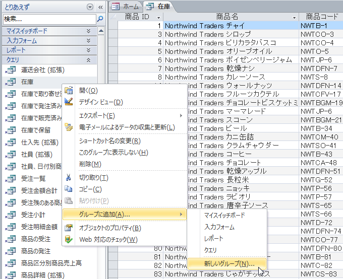 ユーザー設定のカテゴリとユーザー設定のグループをナビゲーション ウィンドウで開き、新しいグループに配置するオブジェクトを右クリックして、ショートカットメニューより[グループに追加]をポイントし、[新しいグループ]をクリックします。