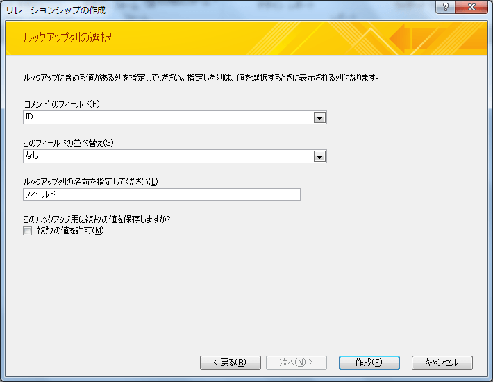 - ルックアップ列に含める値を指定し、複数の値を許可するかどうかを設定して[作成]ボタンをクリックします。