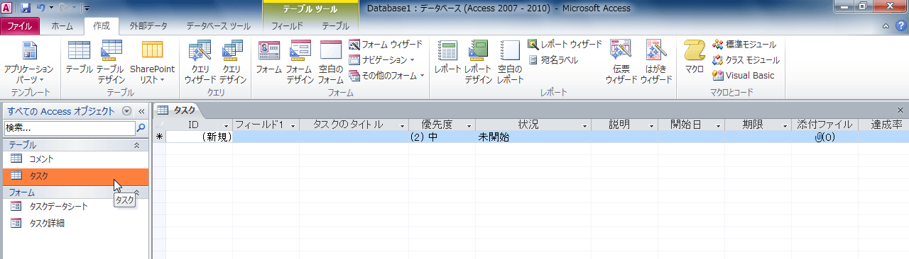 - [タスク]テンプレートに関係するオブジェクトが自動生成されました。[タスク]のテーブルを開くと下の図のようになります。