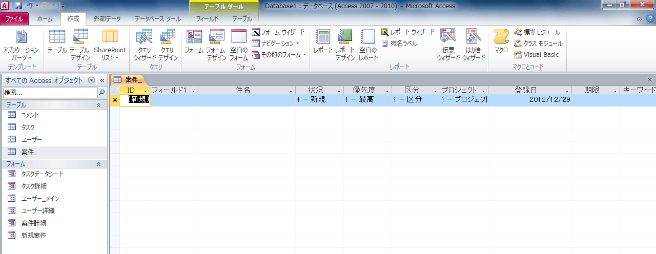 - [案件]テンプレートに関係するオブジェクトが自動生成されました。[案件_]のテーブルを開くと下の図のようになります。
