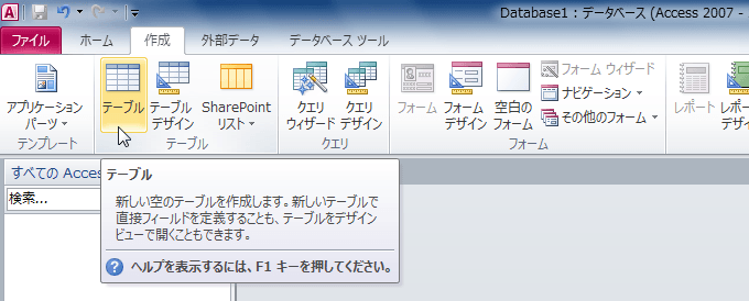 新しい空のテーブルを作るには、[作成]タブを開き、[テーブル]グループの[テーブル]をクリックします。すると未保存の「テーブル1」が生成されます。
