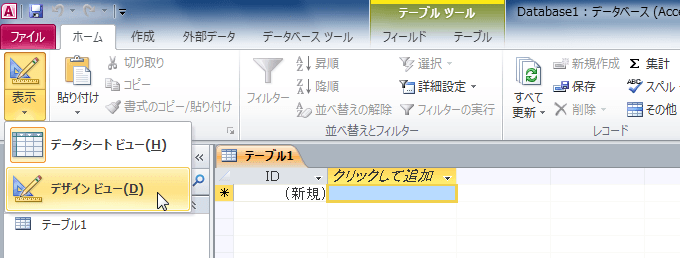 - [表示]グループの[表示]をクリックするか、[表示]の▼をクリックして[デザインビュー]を選択します。