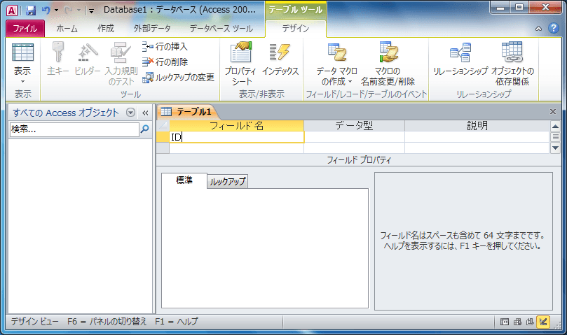 - デザインビューで新しい空のテーブルが開きました。
