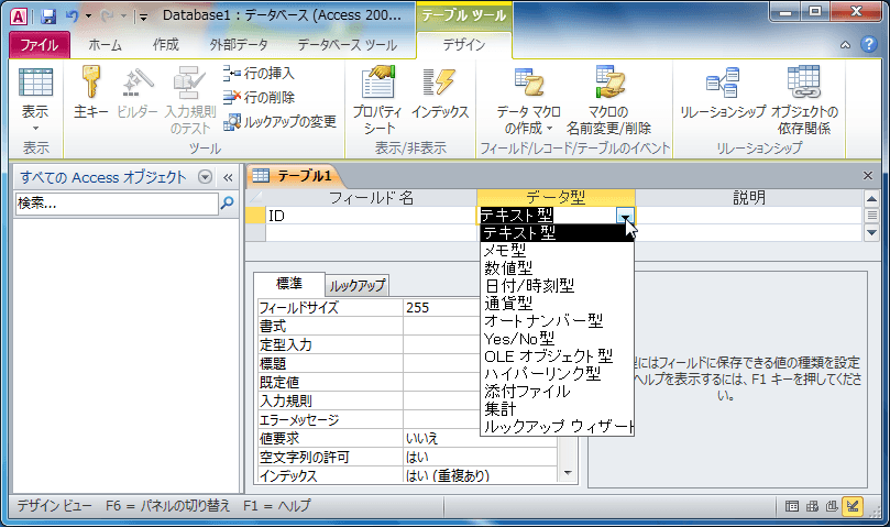 - フィールド名を入力した後Enterキーを押すと、データ型にカーソルが移動し、右側に▼印が出現します。データ型を選択してください。