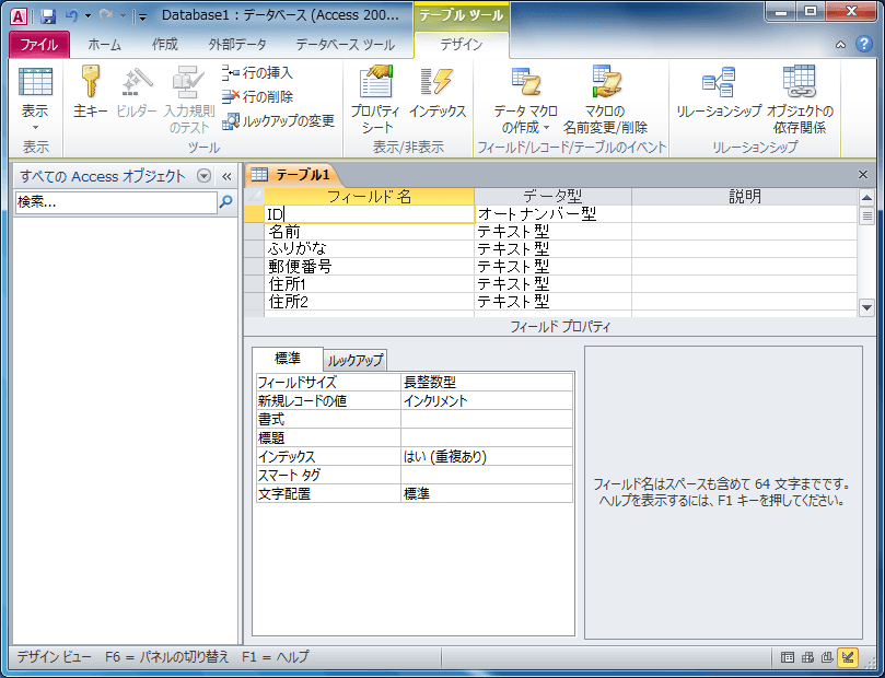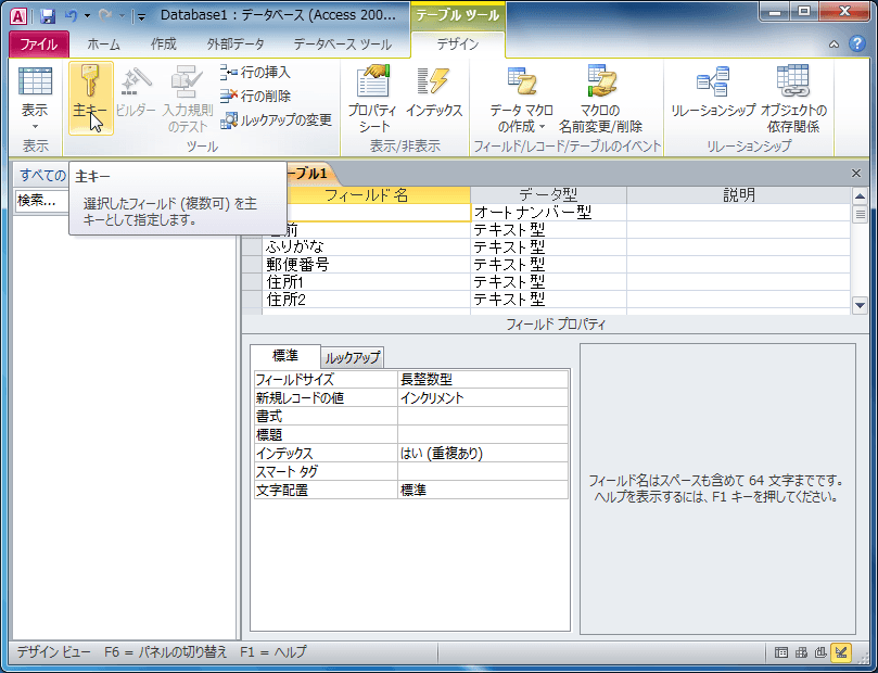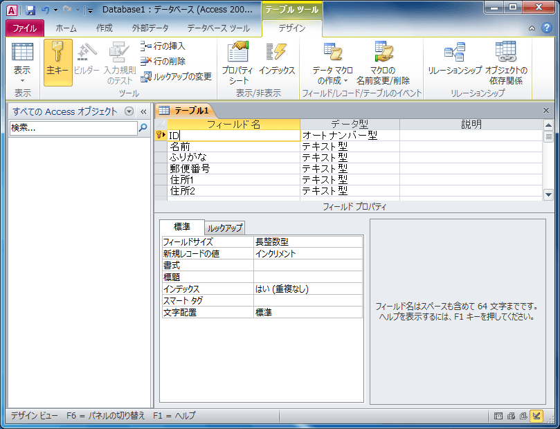 テーブルの各レコードの固有に識別する主キーを設定します。フィールド名がIDに主キーを設定するのがいいでしょう。データ型は数値型、またはオートナンバー型が一番望ましいと思います。
