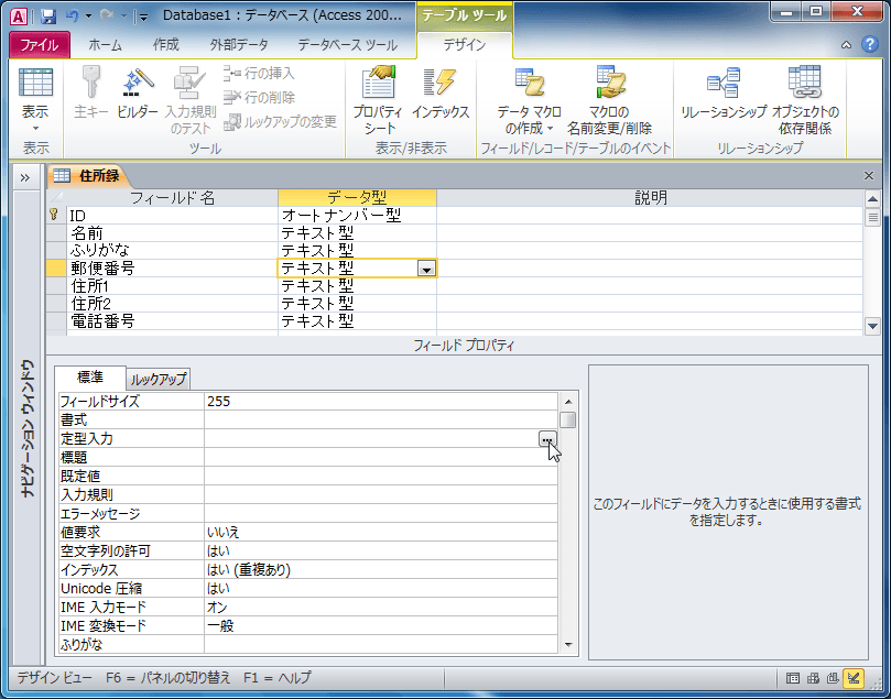 定型入力とは、入力をスムーズに行うために設定する書式のことです。設定したいフィールドを選択し、フィールドプロパティの[標準]タブにある[定型入力]ボックスにカーソルを移動してウィザード起動ボタンをクリックし、一覧から定型入力オプションを指定します。