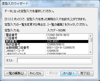 - 定型入力ウィザードが始まります。定型入力を一覧から「郵便番号」を選択して、[次へ]ボタンをクリックします。