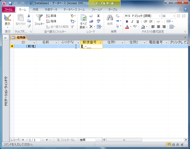 定型入力とは、入力をスムーズに行うために設定する書式のことです。郵便番号の定型入力に設定されている場合、___-____ のように正確に示すことができます。ここでは、「郵便番号」フィールドに郵便番号の定型入力ウィザードを使って設定する方法について説明します。