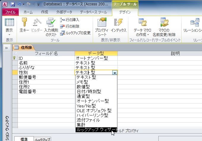 - ▼をクリックして一覧から[ルックアップウィザード]を選択します。