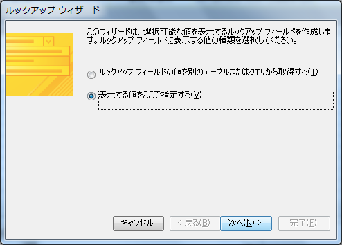 表示する値を今から指定しますので、「表示する値をここで指定する」を選択して、[次へ]をクリックします。