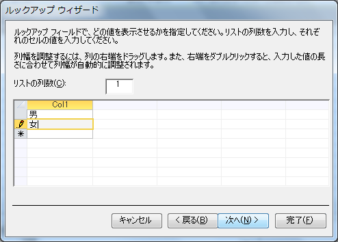 - どの値を表示させるか指定します。2択ですので、まず「男性」と入力した後Tabキー、