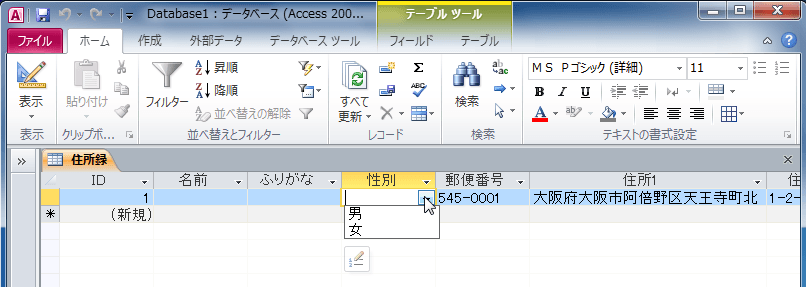 - 性別フィールドのデータ型にカーソルを移動します。