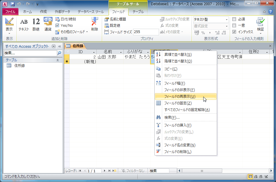 フィールドを非表示にするには、対象となるフィールドを右クリックして、ショートカットメニューより[フィールドの非表示]をクリックします。非表示にされたフィールドを再表示するには、任意のフィールドを右クリックしてショートカットメニューより[フィールドの再表示]を選択し、表示したいフィールドにチェックを付けます。