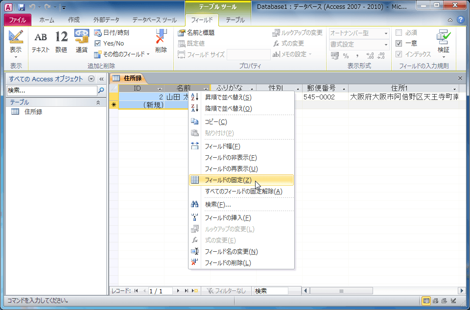 - 固定したいフィールドを選択して右クリックし、ショートカットメニューより[フィールドの固定]を選択します。