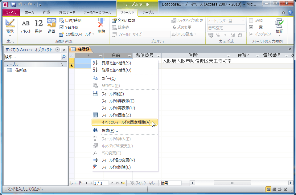 - 任意のフィールドを右クリックして、ショートカットメニューより[すべてのフィールドの固定解除]を選択します。