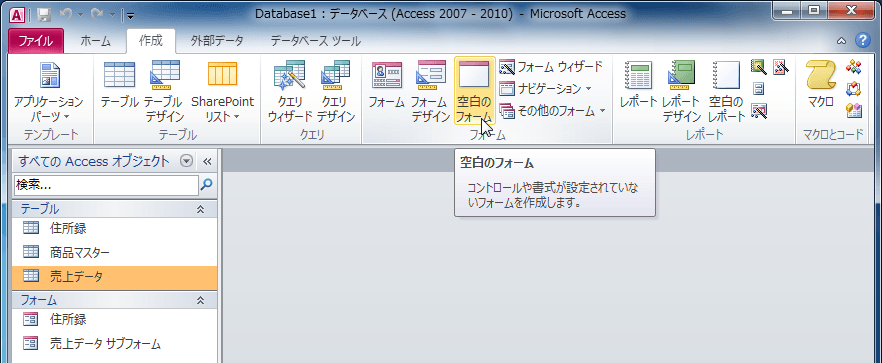 - [作成]タブを開き、[フォーム]グループの[空白のフォーム]を選択します。