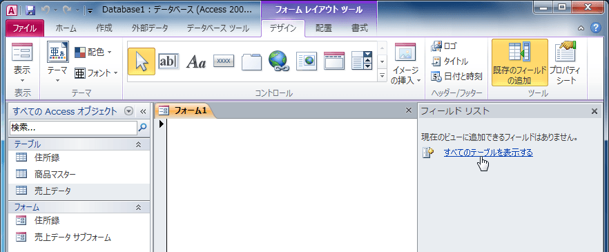 コントロールや書式が設定されていないフォームを作成するには、[作成]タブを開き、[フォーム]グループの[空白のフォーム]を選択して、フィールドリストを表示して、必要なフィールドをドラッグ&ドロップしていきます。