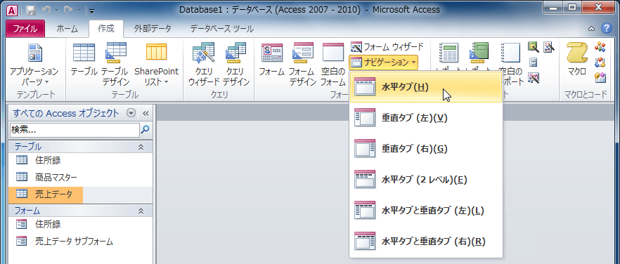 水平または垂直タブを使ったナビゲーションフォームを作成するには、[作成]タブを開き、[フォーム]グループの[ナビゲーションフォーム]をクリックして、一覧からナビゲーションフォームのスタイルを選択します。