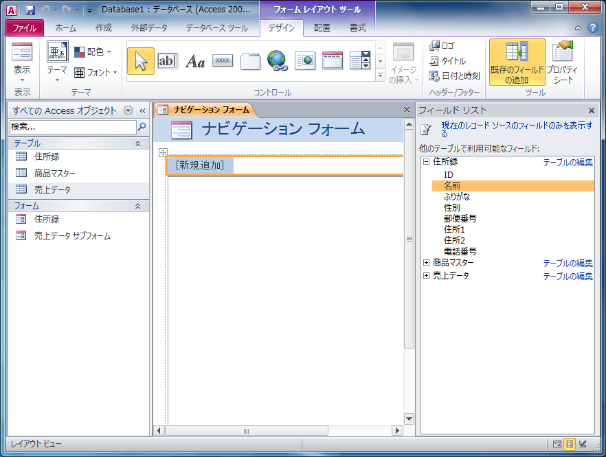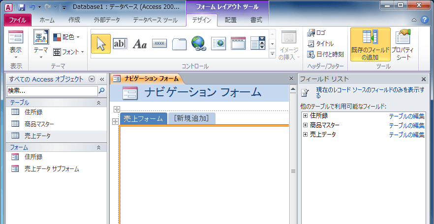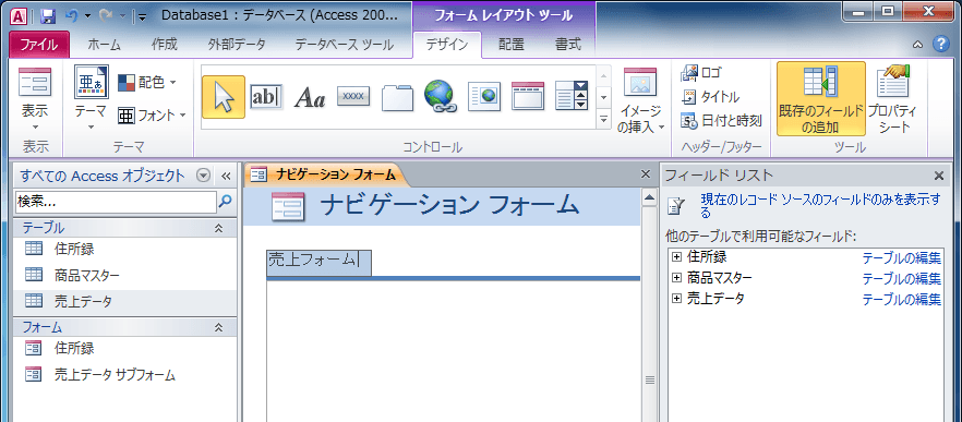- [作成]タブを開き、[フォーム]グループの[ナビゲーションフォーム]をクリックします。