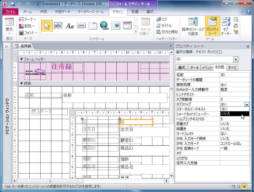 [フォームデザインツール]の[デザイン]タブを開き、対象となるオブジェクトを選択して、[ツール]グループの[プロパティシート]を選択します。ショートカットキーはAlt+Enterです。ここでは、入力不要なフィールドのタブストップをスキップする方法について説明します。
