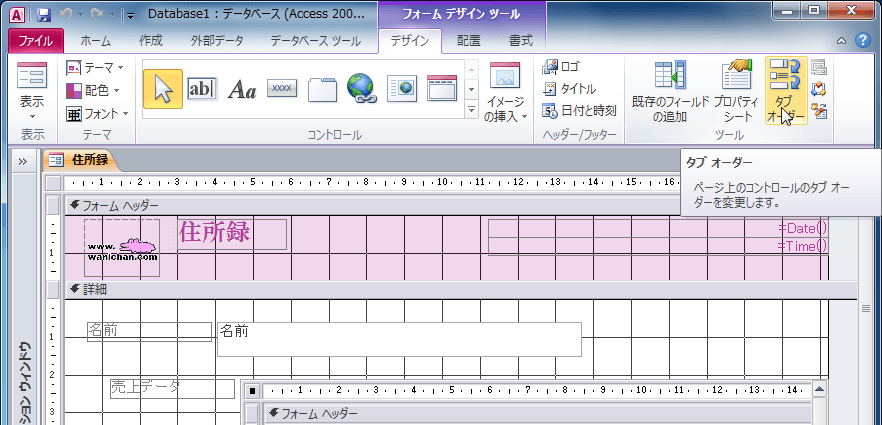 - [フォームデザインツール]の[デザイン]タブを開き、[ツール]グループの[タブオーダー]を選択します。