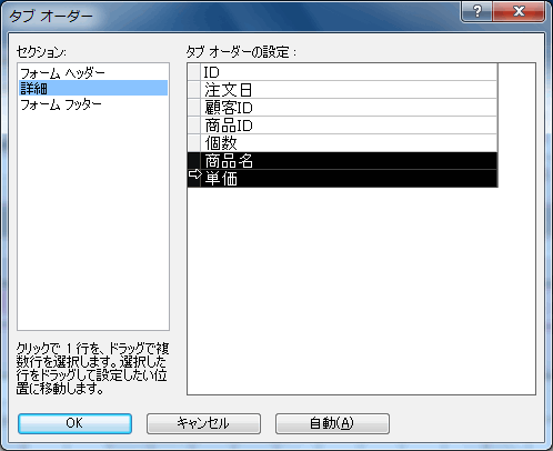 - タブオーダーが変更されたら[OK]ボタンをクリックします。