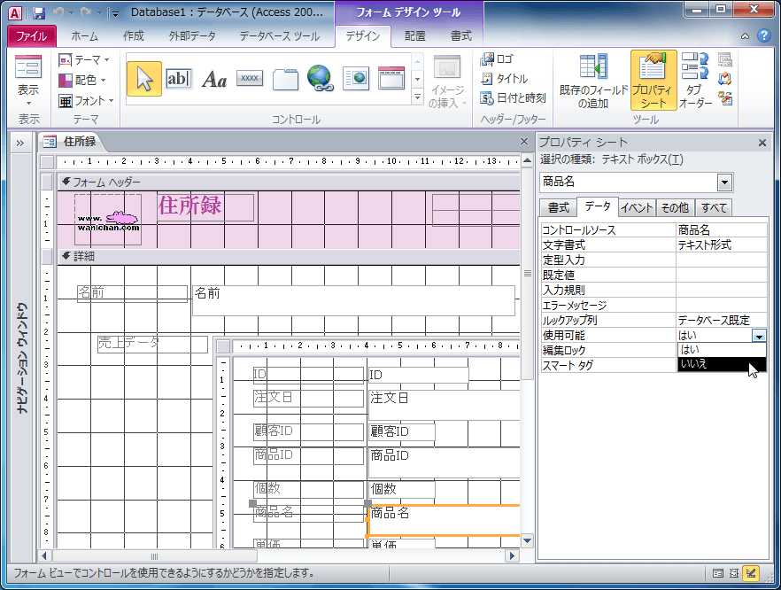 参照されているフィールドを入力不可にするには、対象となるフィールドのオブジェクトを選択してプロパティシートを表示し、[データ]タブの[編集ロック]を[はい]にします。[使用可能]を[いいえ]にするとグレー表示になります。