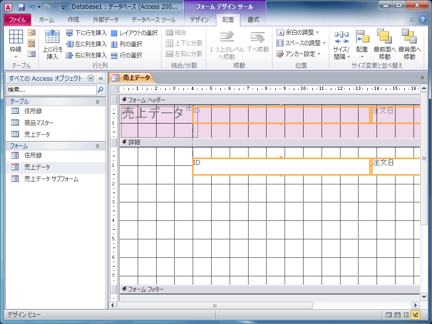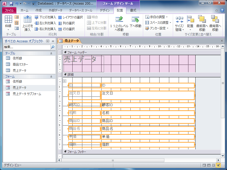 単票や帳票フォームのテーブルレイアウトには、集合形式と表形式の2通りあります。レイアウトビューまたはデザインビューに切り替えて、対象となるオブジェクトをすべて選択し、[フォームデザインツール]の[配置]タブを開いて、[テーブル]グループの[集合形式]または[表形式]を選択します。デザインビューに切り替えるとオブジェクトを簡単にまとめて選択できます。