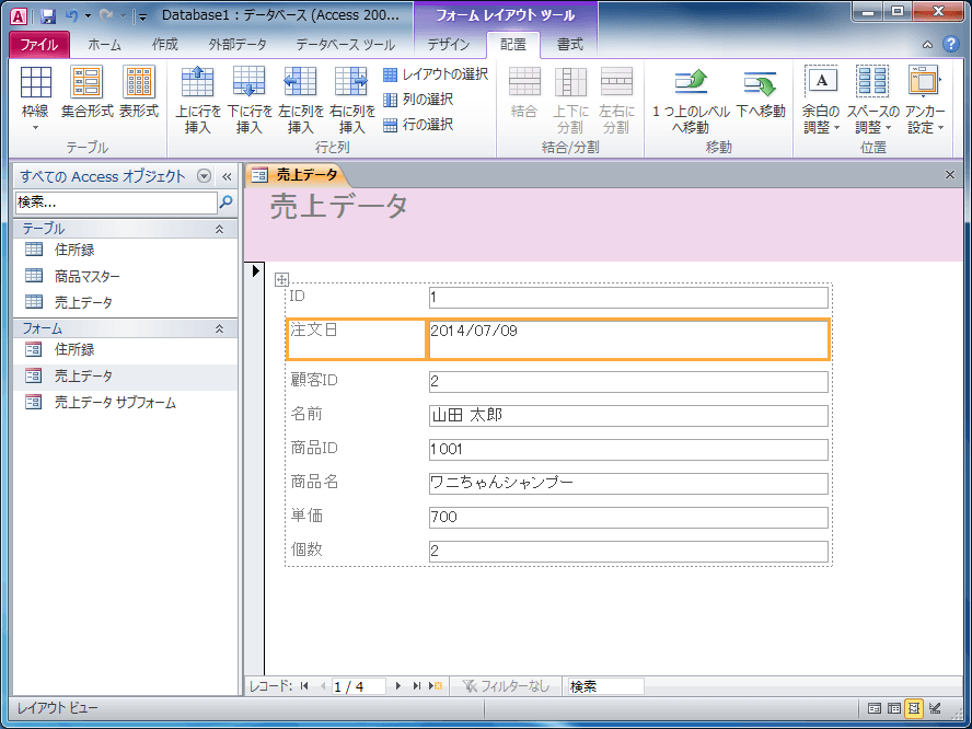 フォームウィザード等で配置されたコントロールの順序をあとで変更できます。移動したいコントロールを選択し、[フォームデザインツール]の[配置]タブを開いて、[移動]グループから[一つ上のレベルへ移動]または[下へ移動]を選択します。