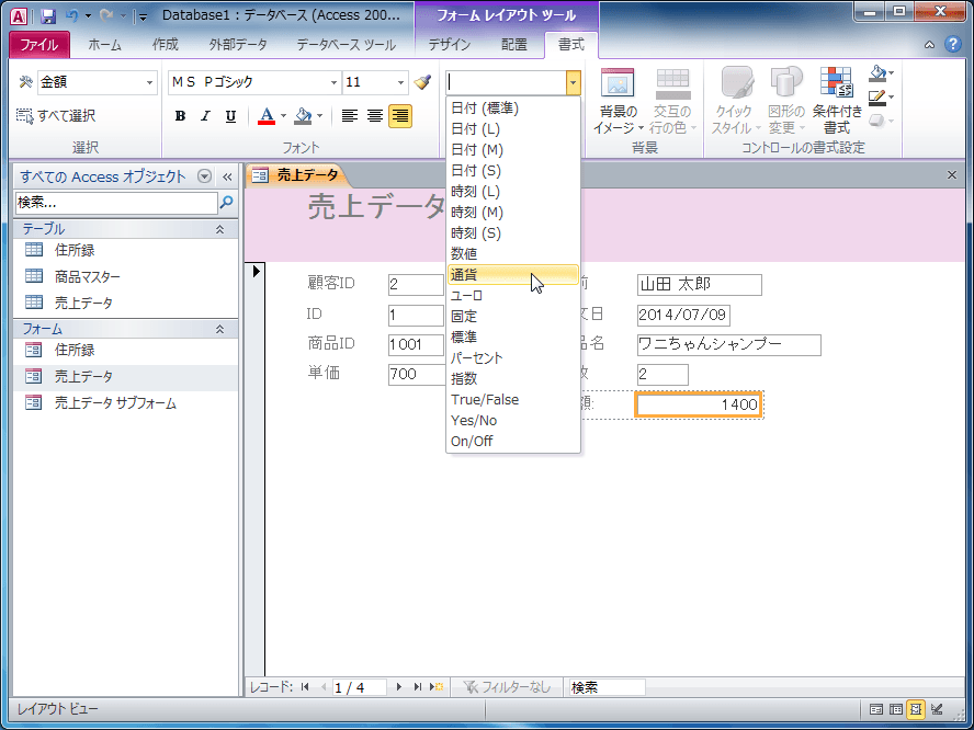 フォームの書式オプションを適用する