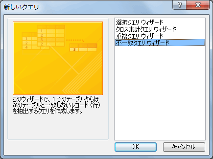 - [不一致クエリウィザード]を選択して[OK]ボタンをクリックします。