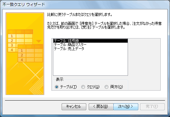 - 比較に使う他のテーブルまたはクエリを選択して[次へ]ボタンをクリックします。