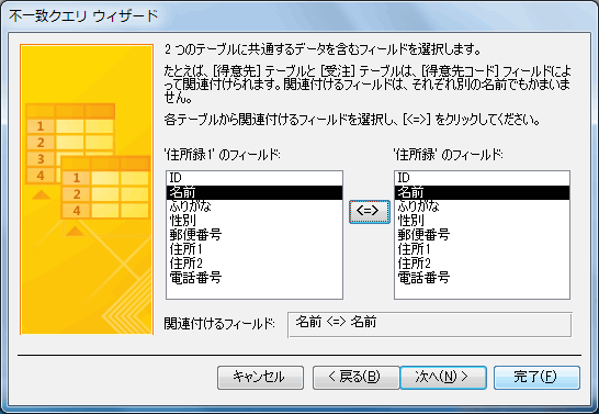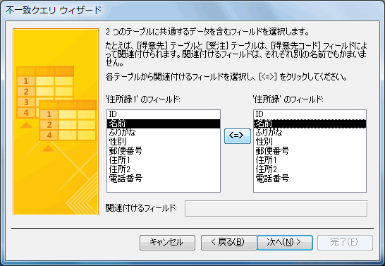 - 2つのテーブルに共通するデータを含むフィールドを選択して[<=>]ボタンをクリックします。
