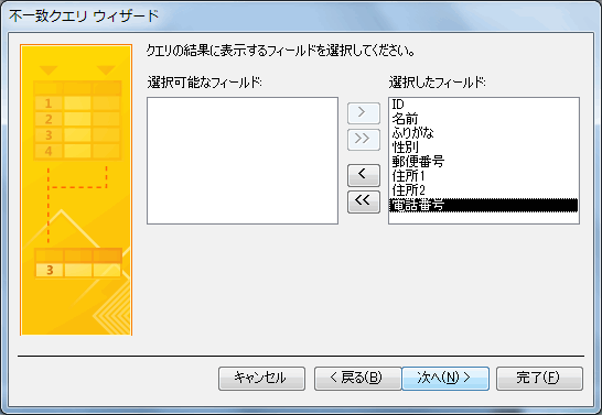 - クエリの結果に表示するフィールドを指定して[次へ]ボタンをクリックします。