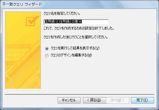 - クエリ名を指定します。クエリを作成した後に行うことを選択して[完了]ボタンをクリックします。