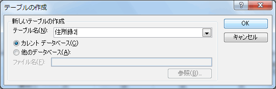 テーブルの名前を入力します。現在開いているデータベースにテーブルを作成するには[カレントデータベース]を選択して[OK]ボタンをクリックします。