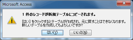 - 新規テーブルにコピーされるメッセージが表示されます。新しいテーブルを作成してもいい場合は[はい]ボタンをクリックします。