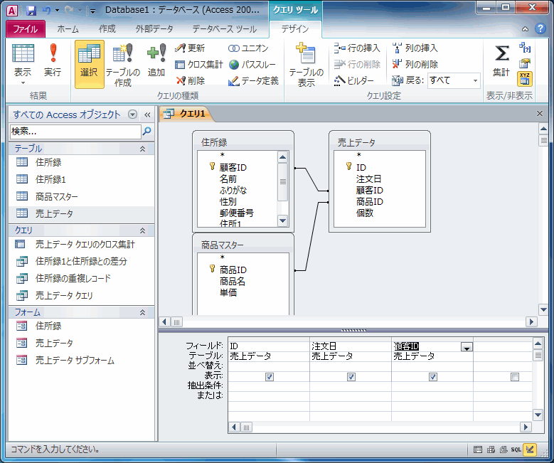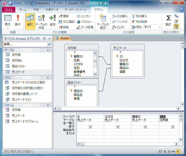 フィールドリストから追加したいフィールドをダブルクリックするか、複数のフィールドを選択してまとめてデザイングリッドまでドラッグ&ドロップします。また、デザイングリッドの[フィールド]ボックスから使いたいフィールドを選択してもよいでしょう。フィールドに[*]のついたものを選択すると、テーブルのすべてのフィールドをまとめて追加できますが、個々のフィールドの条件設定はできません。