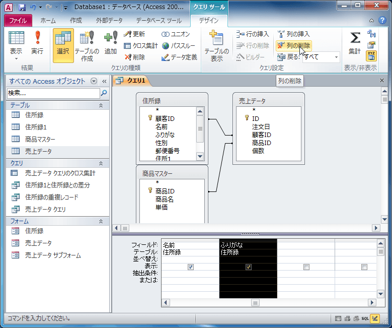 - [クエリツール]の[デザイン]タブ、[クエリ設定]グループの[列の削除]をクリックします。
