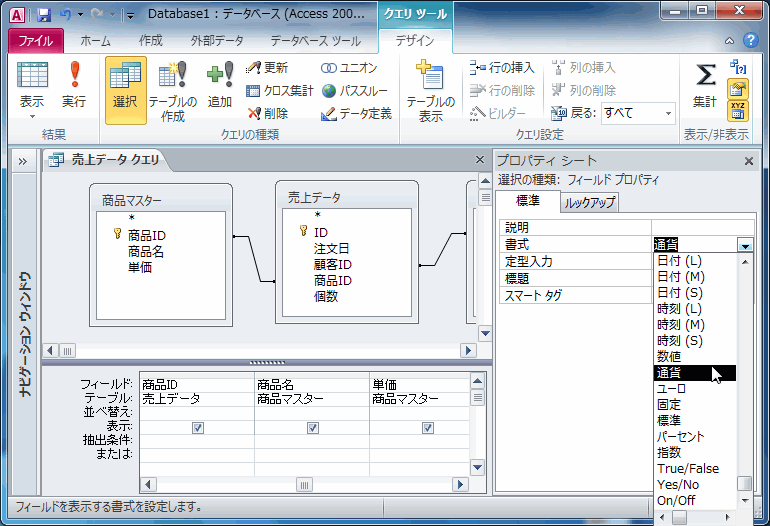 - プロパティシートの[書式]行から[通貨]を選択します。