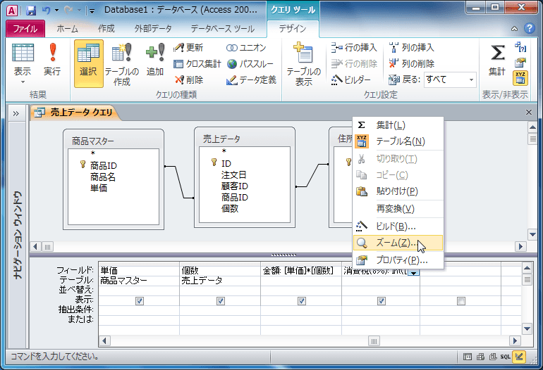 - フィールド行を右クリックして、ショートカットメニューより[ズーム]を選択します。